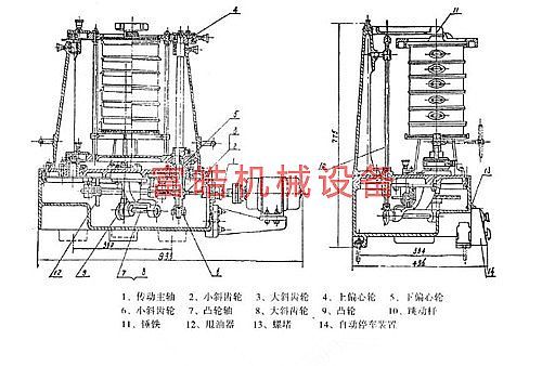 拍擊篩由電機(jī)通過同步帶,帶動齒輪變速后使主軸轉(zhuǎn)動,主軸帶動偏心輪使滑板帶動試驗(yàn)篩左右搖動,同時帶動頂桿齒輪轉(zhuǎn)動,頂擊拍錘,拍擊試驗(yàn)篩,使試驗(yàn)篩、分樣篩中的物料篩分。