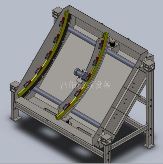 弧形篩主要由篩箱、篩網(wǎng)、激振器、減振彈簧和下座架等組成。香蕉篩是由電動(dòng)機(jī)和激振器作為振動(dòng)源,激振器主要是由偏心軸、皮帶輪、軸承及軸承座等組成,激振器安裝在篩箱側(cè)板上,并由電動(dòng)機(jī)通過(guò)三角皮帶或軟連接與其相連,電動(dòng)機(jī)帶動(dòng)偏心軸旋轉(zhuǎn),產(chǎn)生離心慣性力,迫使篩箱振動(dòng)。